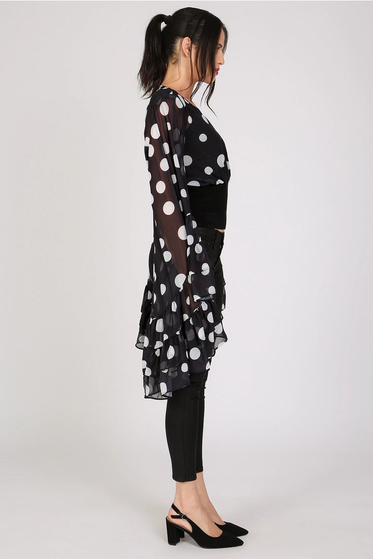 Black with white polka dot bell sleeve blouse. It's the dramatic sleeves for me! Guarateed to make a statement with any bottom of your choice!