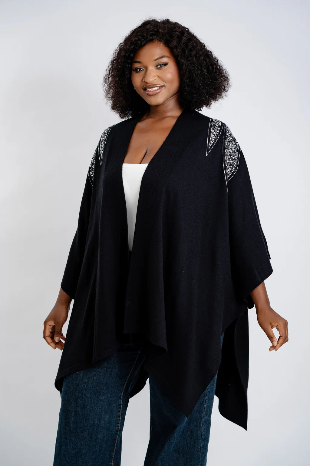 Experience sophisticated comfort with this women's embellished poncho. Designed with a front-open style embellished stones that provide a refined, elegant accent. Perfect for enhancing casual wear or dressier outfits, this soft-feel poncho offers versatility and timeless style in one essential piece.