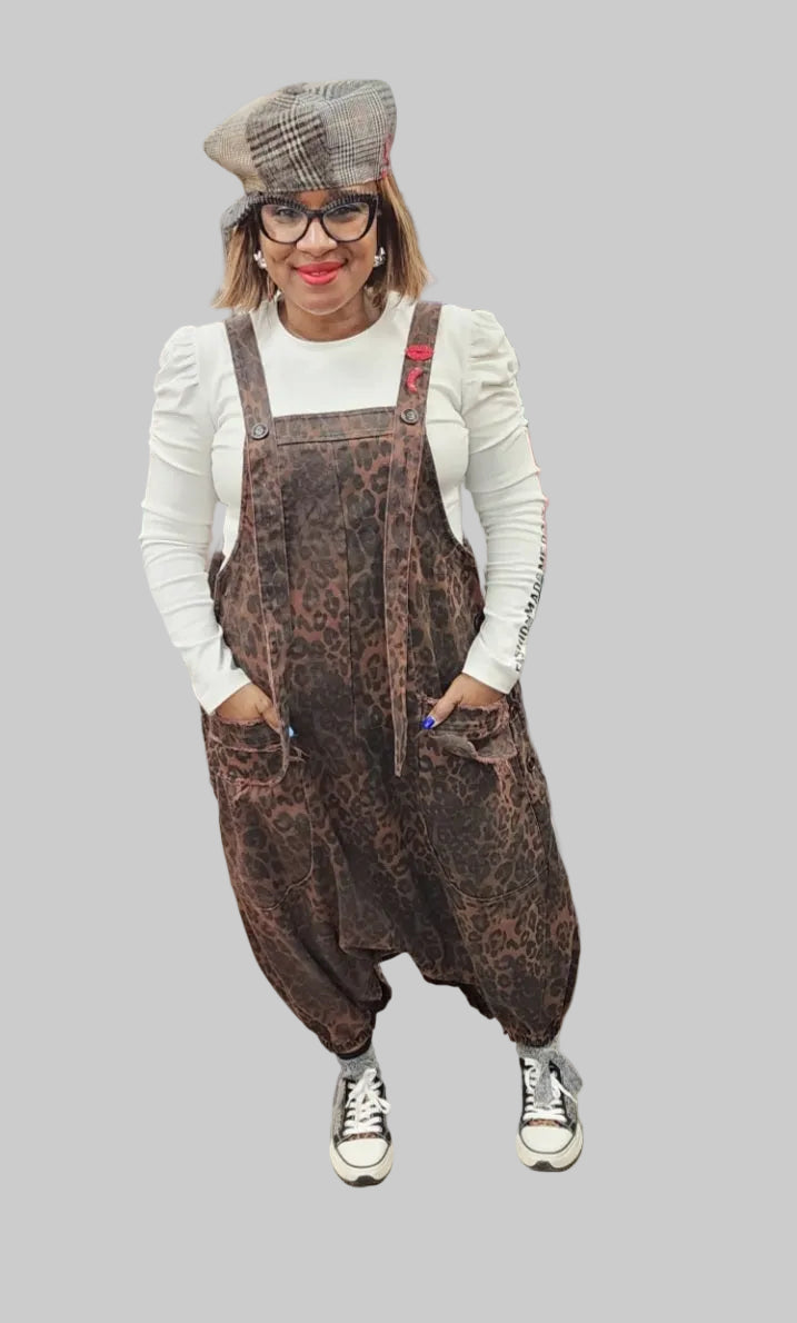 Brown leopard overalls with large front pockets, backpockets and button closure which allows you to wear as a dress if desired.