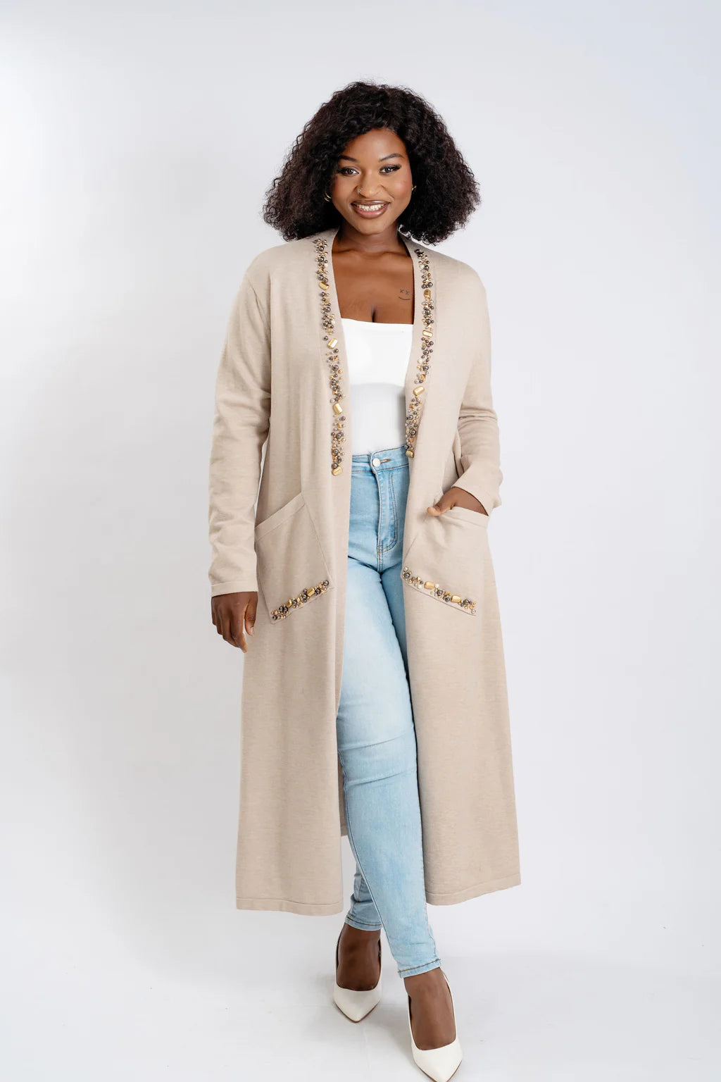 Experience sophisticated comfort with this women's embellished cardigan with pockets. Designed with a front-open style and adorned with integrated gemstones that provide a refined, elegant accent. Perfect for enhancing casual wear or dressier outfits, this soft-feel cardigan offers versatility and timeless style in one essential piece.