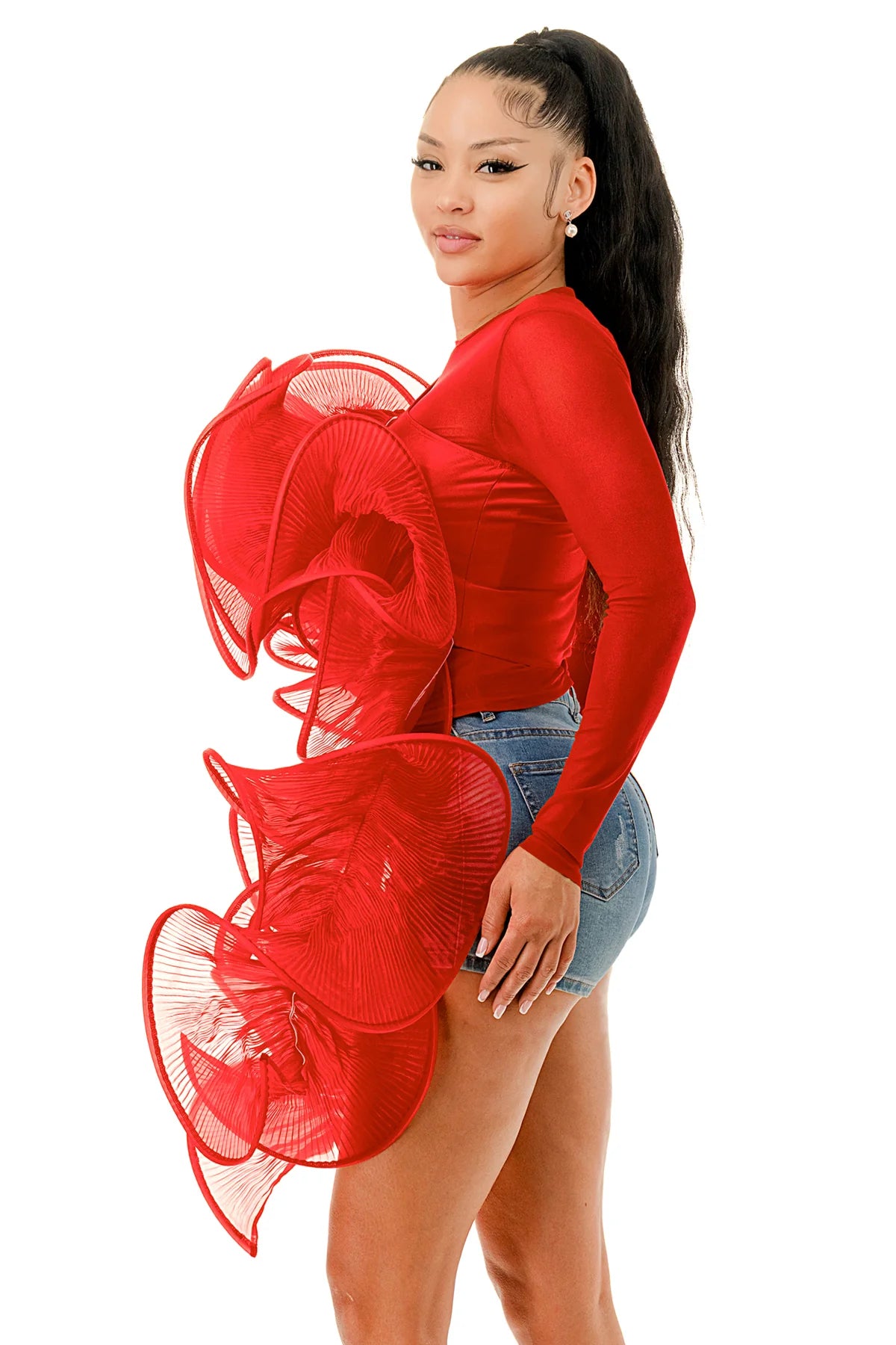 Red one shoulder swirl top & mesh top. 3 ways to rock this beauty!  However you decide guaranteed to turn heads!