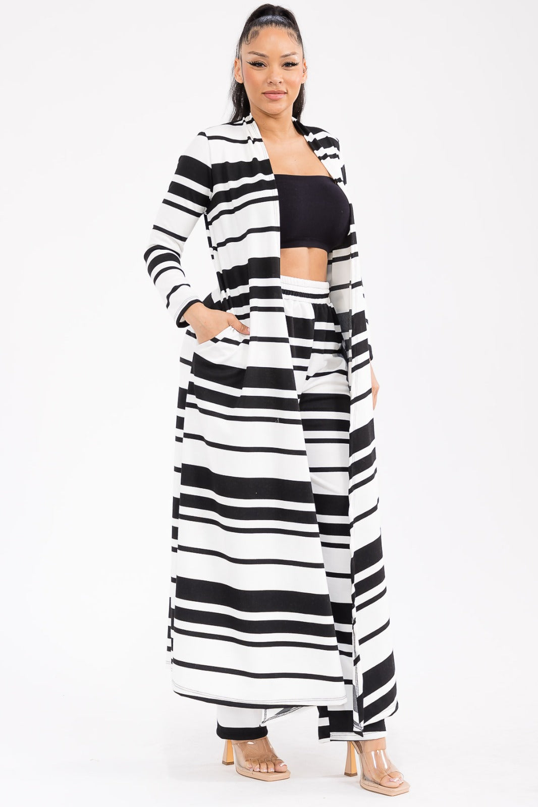 Black stripe duster pant set. Rock the set or as seperates. Great for any occasion, dressy or casual, you have many options.