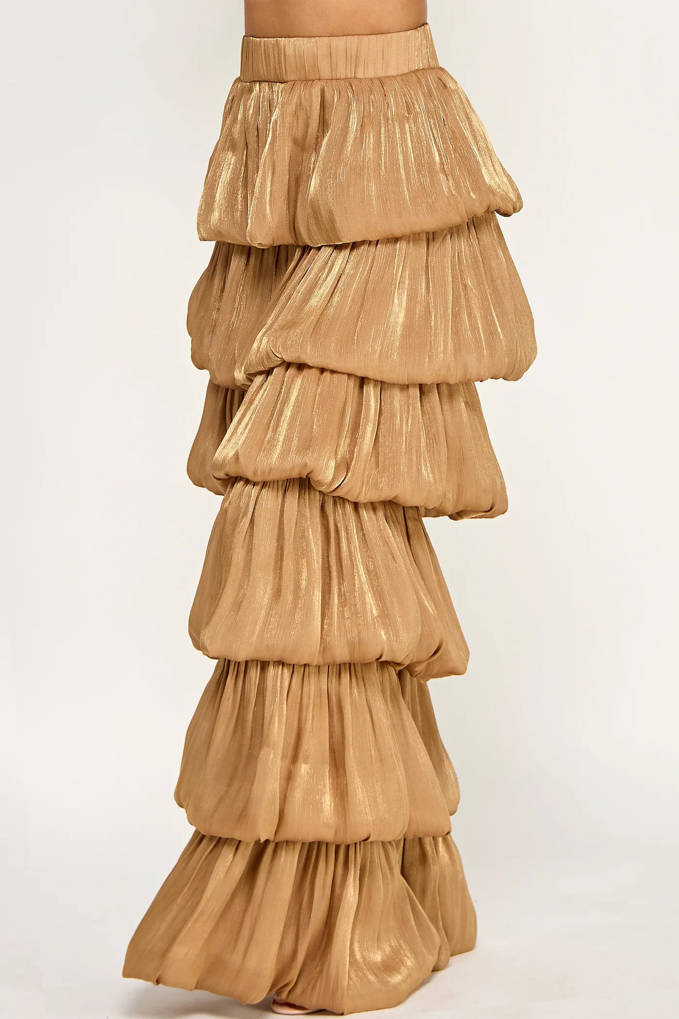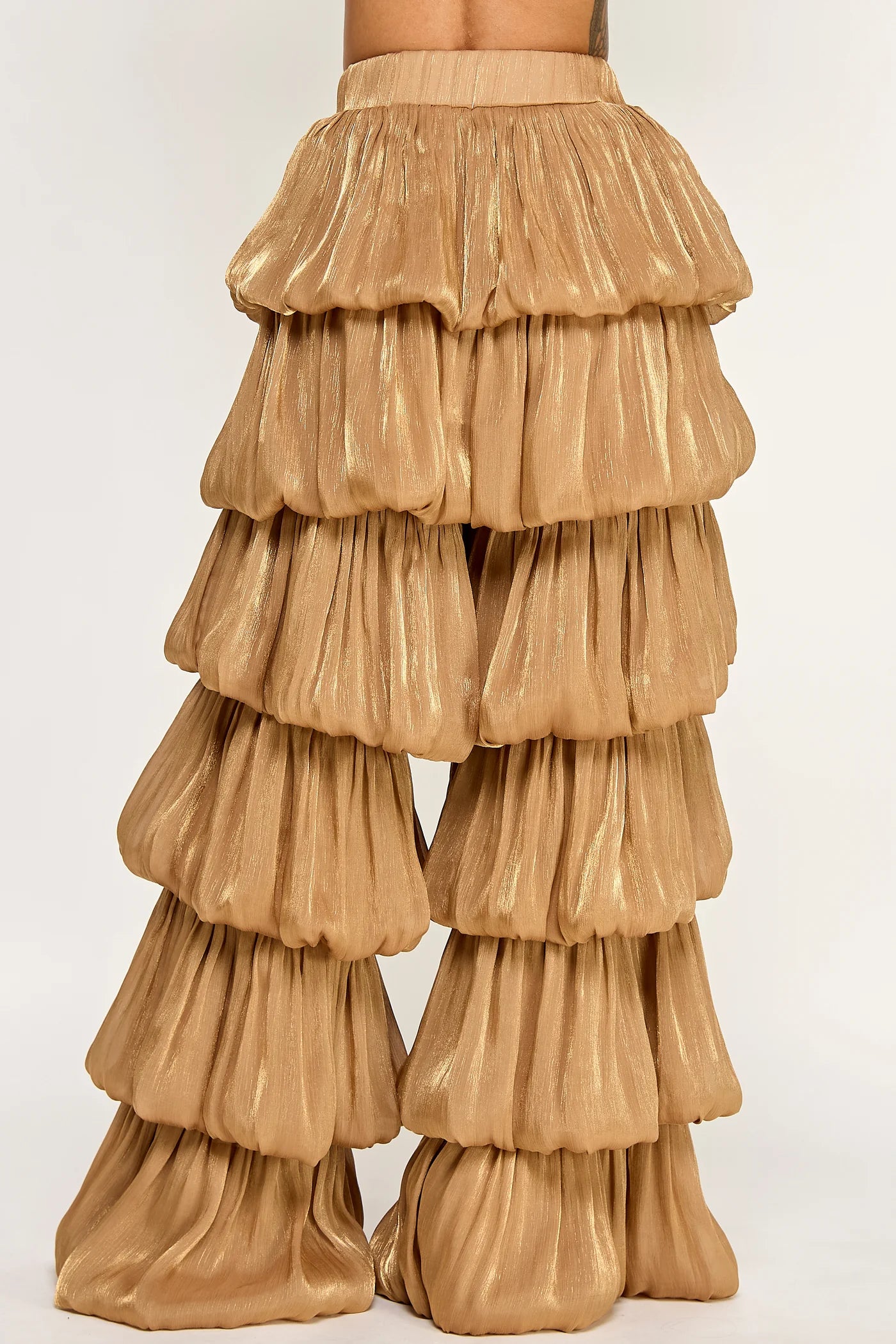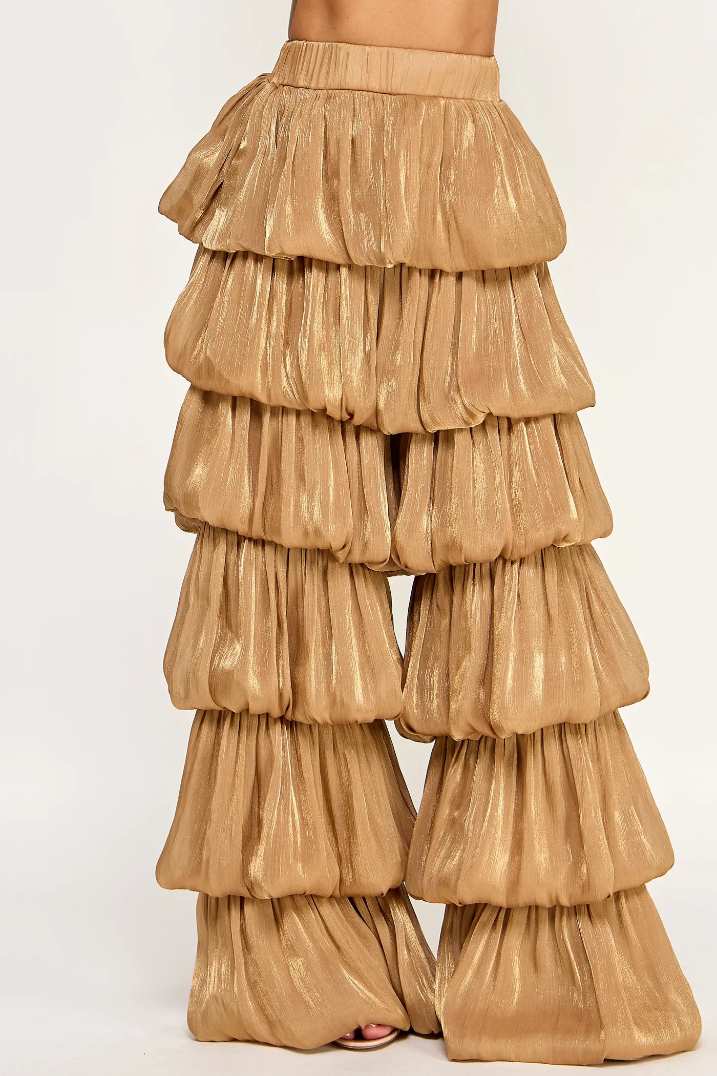 Tan sheer organza high waisted tiered pants. Sider zipper, elastic waist. An abundace of layers is a dramatic FlyGirl statement for sure!