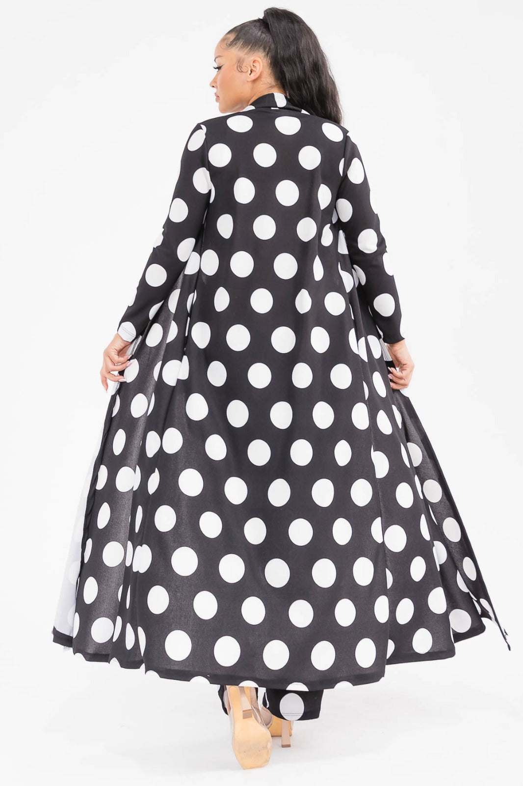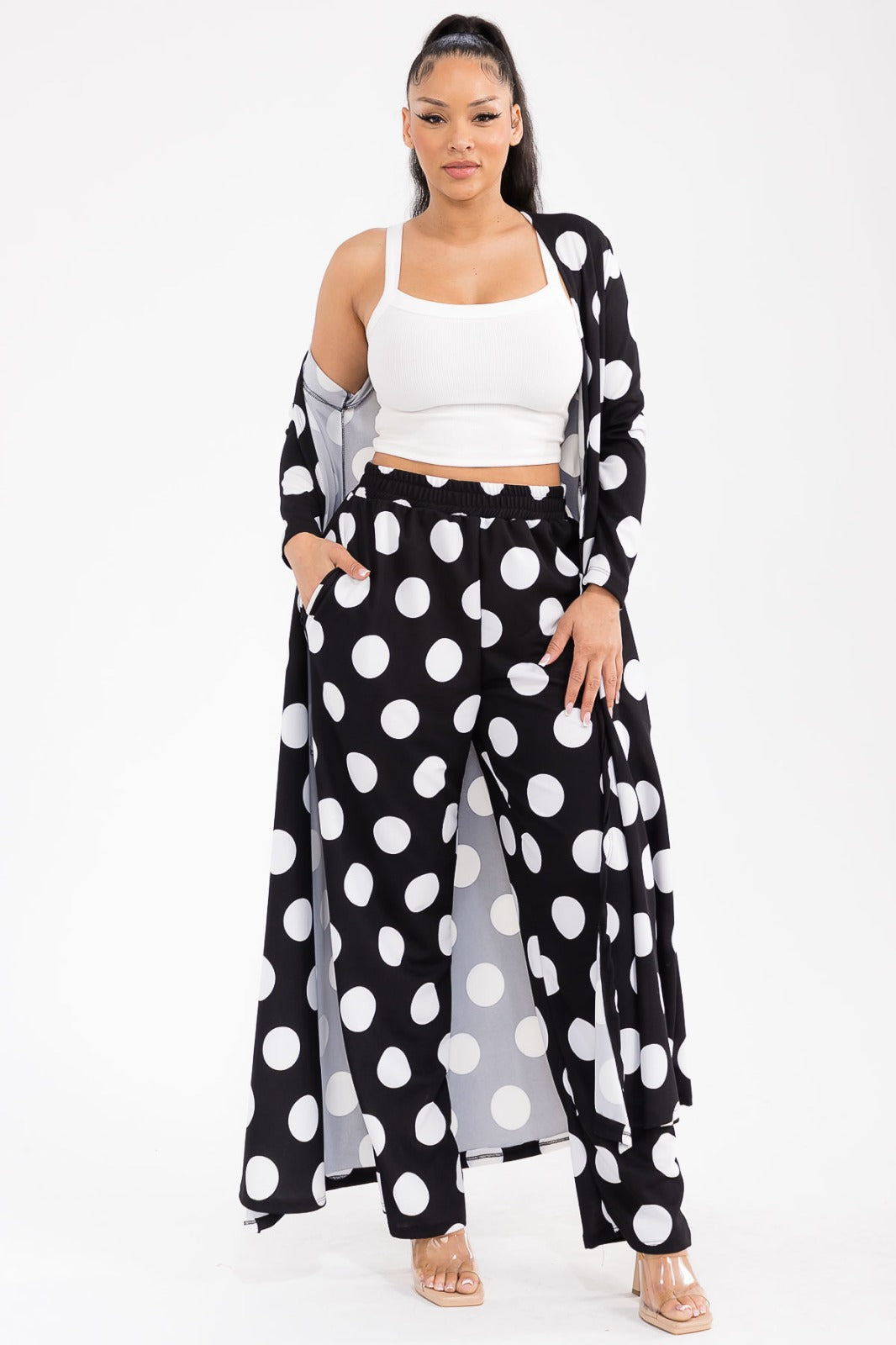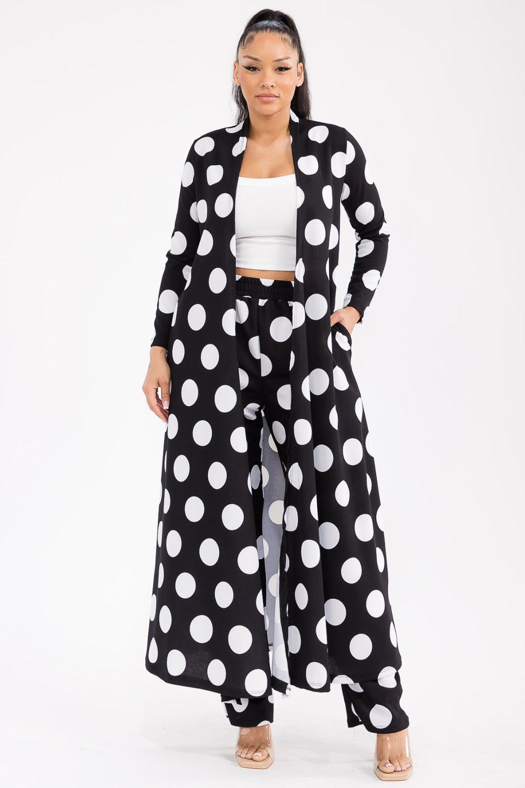 White polka dot duster pant set. Rock the set or as seperates. Great for any occasion, dressy or casual, you have many options.